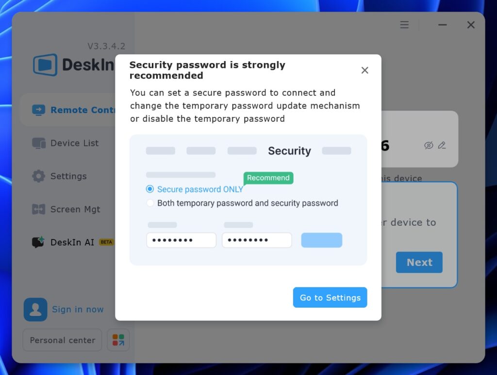 Once installed, the initial interface immediately highlights a strong emphasis on password and account security, encouraging users to secure as many elements as possible before establishing any connections, a design choice that reflects growing industry awareness around safer remote access practices.