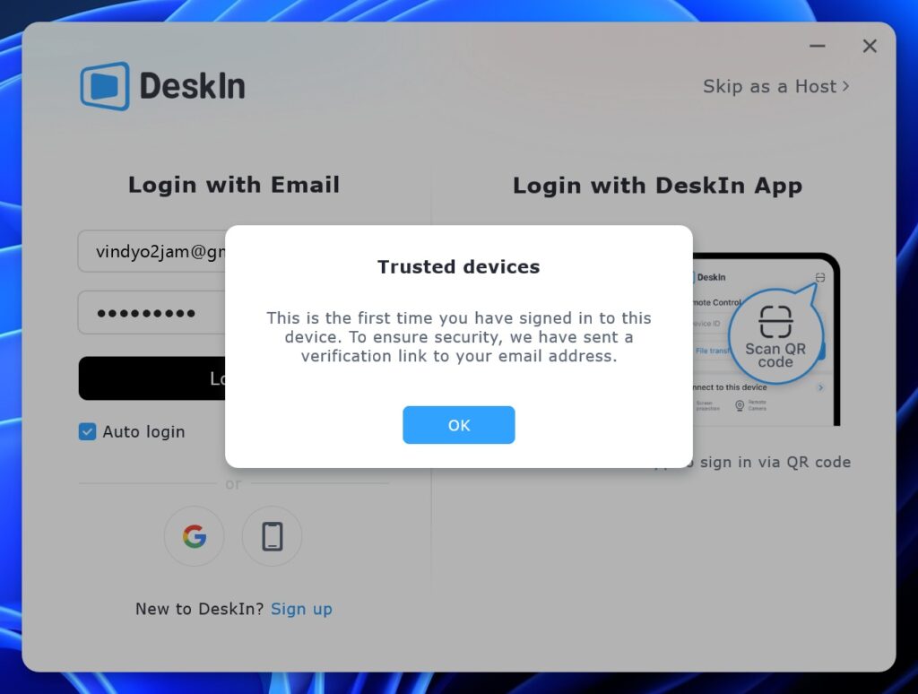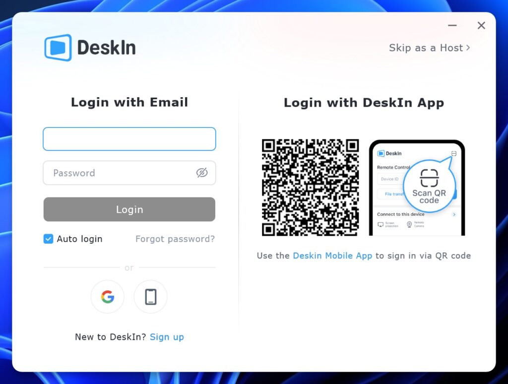 To begin using DeskIn, users must create an account, either through the official website or by signing in with a Google account, after which the desktop client presents a QR code that can be scanned using the DeskIn mobile app as an alternative to manual login.