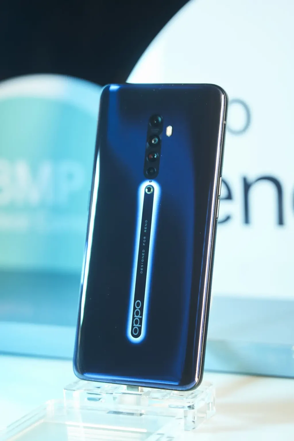 The OPPO Reno2 with its polished exterior on display during the launch event