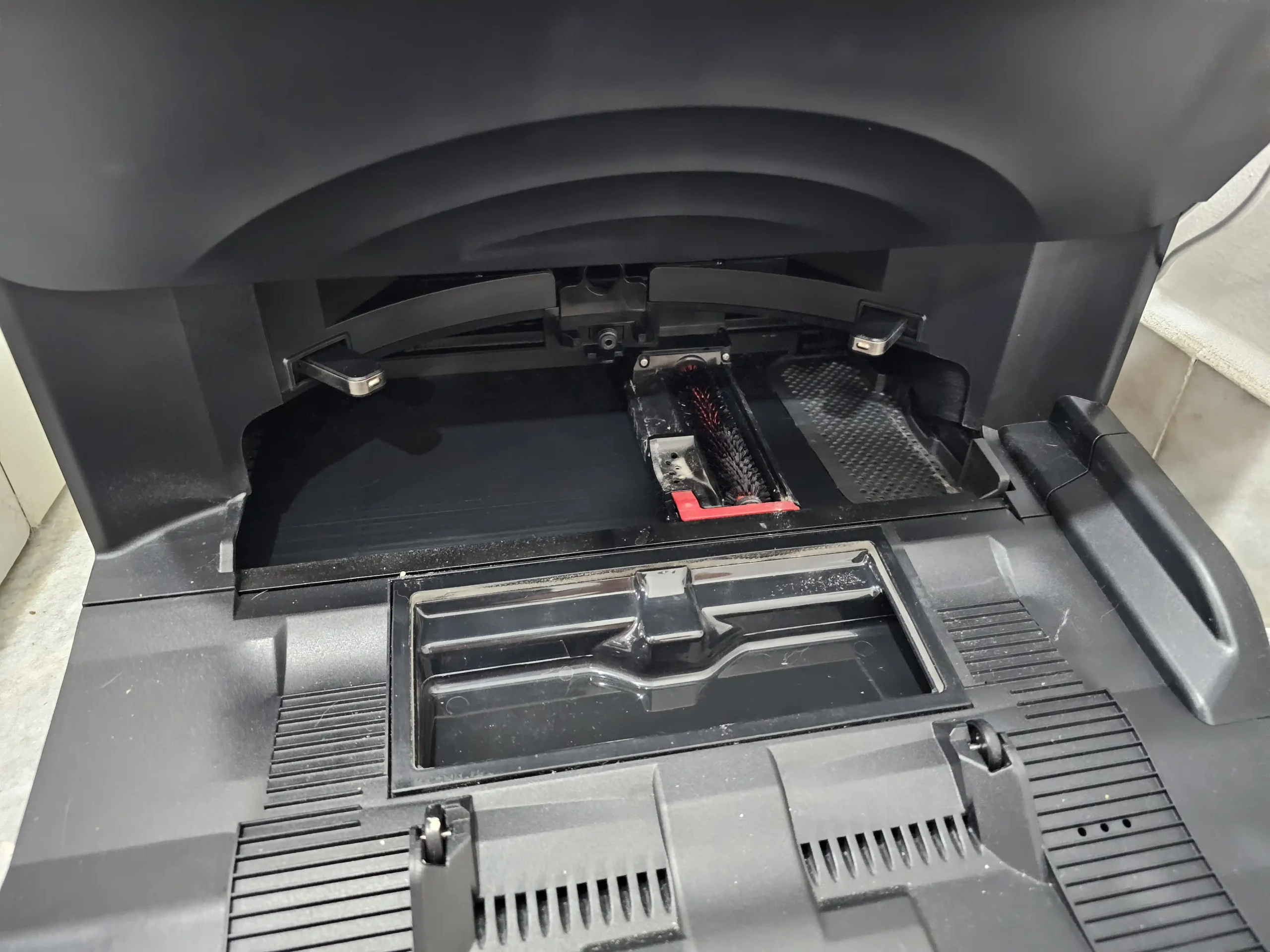This is how it looks at the dock base. You can clearly see the roller brush that will activate to clean the mop cloth. The dock is also capable of emptying the internal canister via the reverse vacuum feature. The idea is identical to Samsung’s Clean Station.