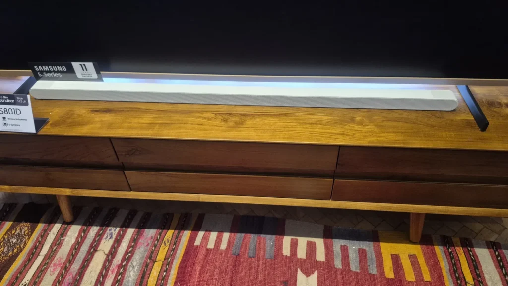 Paired with the setup is the Q990F soundbar, complete with a compact subwoofer and rear speakers. Despite its “small” size, the system easily fills the space and matches the scale of the TV with surprisingly rich surround sound.