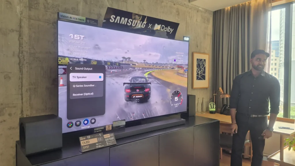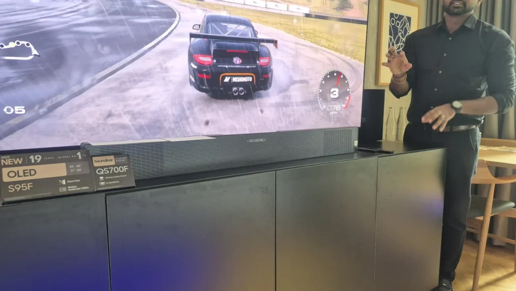 Moving into the gaming room, Samsung switched things up with the S95F OLED – the one built for gamers. It comes with a 165Hz refresh rate, VRR 120Hz for consoles like the PS5 and Xbox Series X, plus NVIDIA G-Sync Compatible and AMD FreeSync Premium support. And like all the models we saw, the anti-glare coating makes a huge difference. Whether sunlight or bright lamps are hitting the panel, the OLED stays distraction-free.